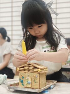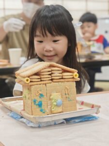 みんな待ちきれずに、おうちを作りながらお口にお菓子を入れてニコニコしながら作っていました。